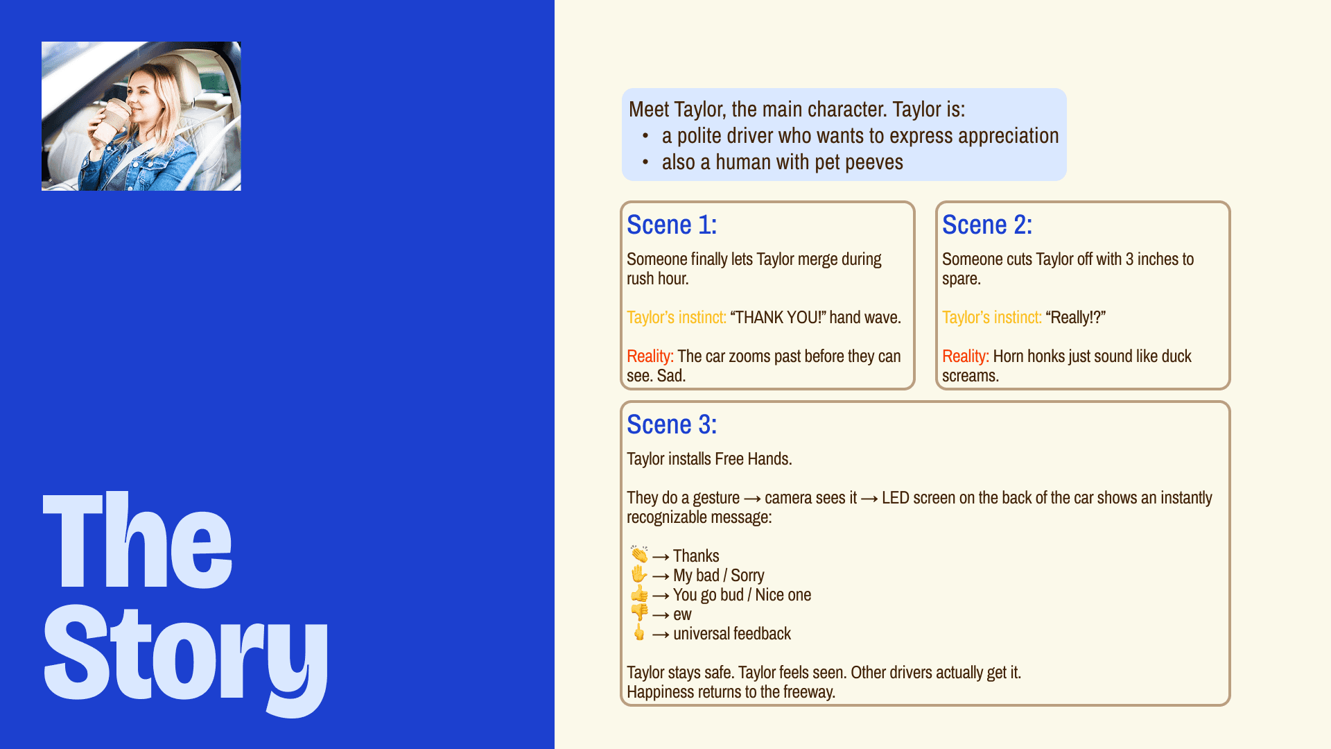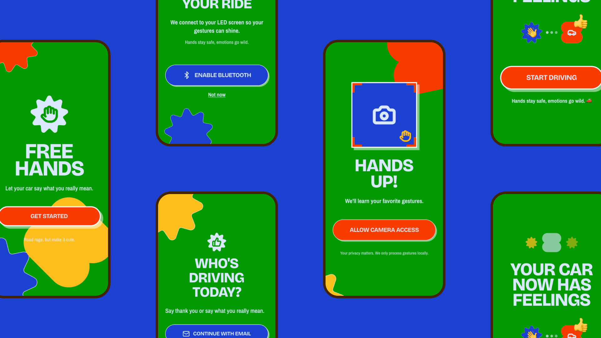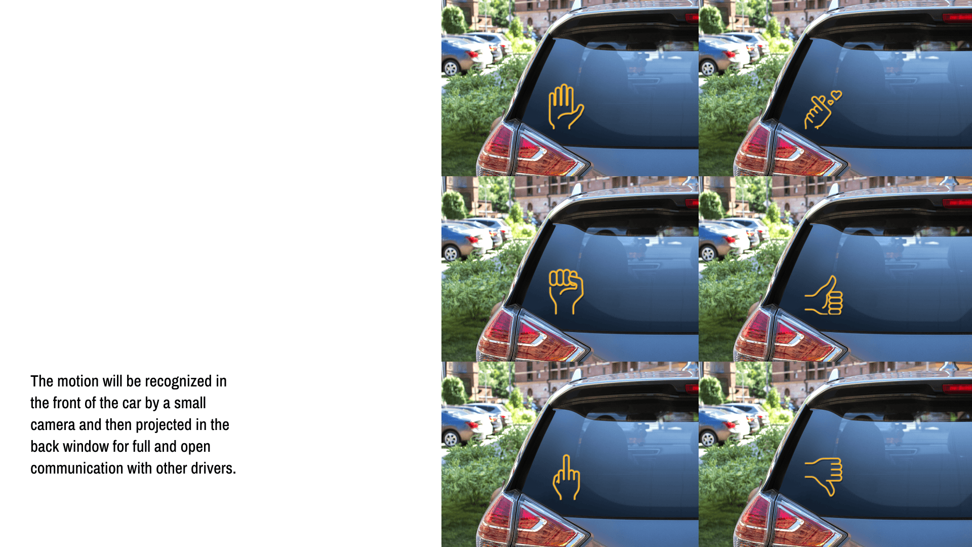 Free Hands explores how Natural User Interfaces can improve communication and safety while commuting by using gesture recognition as the primary interaction method. I designed a system in which a dash-mounted camera interprets driver hand motions and sends visual feedback to an LED display, supported by a mobile setup app that establishes gestures, connectivity, and user settings. Through this process I developed the full interaction flow, visual identity, prototype screens, and NUI logic to demonstrate how gesture-based design can create a more intuitive and accessible driving experience.